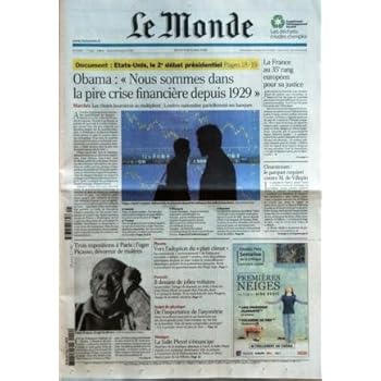 MONDE (LE) N? 19814 du 09-10-2008 OBAMA - NOUS SOMMES DANS LA PIRE CRISE FINANCIERE DEPUIS 1929 LA FRANCE AU 35EME RANG EUROPEEN POUR SA JUSTICE CLEARSTREAM - LE PARQUET RQUIERT CONTRE M. DE VILLEPIN 3 EXPOSITIONS A PARIS - L'OGRE PICASSO DEVOREUR DE MAITRES PLANETE - VERS L'ADOPTION DU PLAN CLIMAT PORTRAIT - IL DESSINE DE JOLIES VOITURES - J.PIERRE PLOUE NOBLE DE PHYSIQUE - DE L'IMPORTANCE DE L'ASYMETRIE - CHERCHEURS JAPONAIS ET AMERICAIN LA SALLE PLEYEL S'EMANCIP