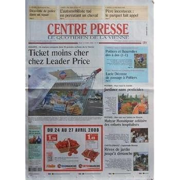 CENTRE PRESSE [No 97] du 24/04/2008 - POITIERS OÇô BOULEVARD DE TISON OÇô DESCENTE DE POLICE DANS UN SQUAT OÇô ROIFFE OÇô HIER MATIN SUR LA D 147 OÇô LOÇÖAUTOMOBILISTE TUE EN PERCUTANT UN CHEVAL OÇô JUSTICE OÇô IL A ETE RELAXE MARDI OÇô PERE INCESTUEUX OÇô LE PARQUET FAIT APPEL OÇô ENQUETE OÇô 10 CHARIOTS COMPARES DANS 10 GRANDES SURFACES DE LA VIENNE OÇô TICKET MOINS CHER CHEZ LEADER PRICE OÇô DU SAVON AU LAIT DE JUMENT OÇô FOOTBALL OÇô MATCH EN RETARD EN DIVISION DOÇÖHONNEUR OÇô POITIERS ET BU. Reviewed by Robert E. Rating: