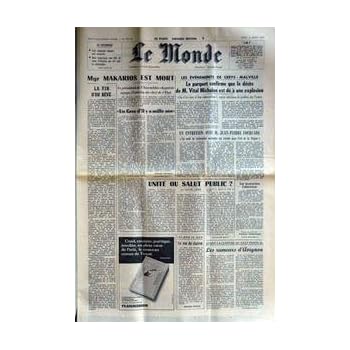 MONDE (LE) [No 10112] du 04/08/1977 - AU MOZAMBIQUE - CENT CINQUANTE MINEURS SONT ENSEVELIS - NEUF TECHNICIENS SONT TUES AU COURS D'EMEUTES QUI ONT SUIVI LA CATASTROPHE - MGR MAKARIOS EST MORT - LE PRESIDENT DE L'ASSEMBLEE CHYPRIOTE ASSURE L'INTERIM DU CHEF DE L'ETAT - UN GREC D'IL Y A MILLE ANS - LA FIN D'UN REVE - LES EVENEMENTS DE CREYS-MALVILLE - LE PARQUET CONFIRME QUE LE DECES DE M. VITAL MICHALON EST DU A UNE EXPLOSION - JE N'AI RIEN A ME REPROCHER , NOUS DECLARE LE PREFET