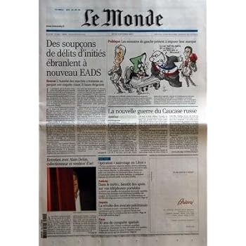 MONDE (LE) [No 19500] du 04/10/2007 - DES SOUPCONS DE DELITS D'INITIES EBRANLENT A NOUVEAU EADS - BOURSE - L'AUTORITE DES MARCHES A TRANSMIS AU PARQUET UNE ENQUETE VISANT 21 HAUTS DIRIGEANTS - ENTRETIEN AVEC ALAIN DELON COLLECTIONNEUR ET VENDEUR D'ART - POLITIQUE - LES MINISTRES DE GAUCHES PEINENT A IMPOSER LEUR MARQUE - LA NOUVELLE GUERRE DU CAUCASE RUSSE - OPERATION SAUVETAGE EN LYBIE - PUBLICITE - DANS LE METRO BIENTOT DES SPOTS SUR VOS TELEPHONES PORTABLES - ENQUETE - LA REVOLTE DES AVOCATS. Reviewed by Rocky C. Rating: