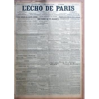 ECHO DE PARIS (L') N? 11773 du 09-11-1916 L???ENNEMI BOMBARDE NOS NOUVELLES POSITIONS - DEUX AVIONS BOCHES ABATTUS - 2400 KILOS DE PROJECTILES SUR FRESCATY ET CHAMBLAY PAR ED - COMMUNIQUE FRANCAIS - AVIATION - COMMUNIQUE BRITANNIQUE - ARMEE D???ORIENT - BULLETIN FINANCIER - AU PARQUET - MARCHE EN BANQUE - LE TABAC AUGMENTERA-T-IL - LE DUC DE CONNAUGHT A L???ELYSEE - ELECTION PRESIDENTIELLE DES ETATS-UNIS - VICTOIRE DE M HUGHES - NEW-YORK 7 NOVEMBRE MINUIT - M HUGHES EST ELU PRESIDENT DE LA RE.... Reviewed by Peter M. Rating: