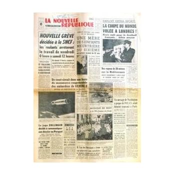 NOUVELLE REPUBLIQUE (LA) [No 6542] du 21/03/1966 - nouvelle greve decidee a la sncf explois extra sportif la coupe du monde volee a londres des vagues de 20 metres sur la mediterranee un message de washington a propos de l'otan serait bientot transmis a paris m. van den boeynants a forme son ministere sans socialiste le juge zollinger decide a communiquer son dossier au parquet un court circuit dans une fusee de manoeuvre responsable des embardees de gemini 8 releve le directeur de la nasa. Reviewed by Victor F. Rating: